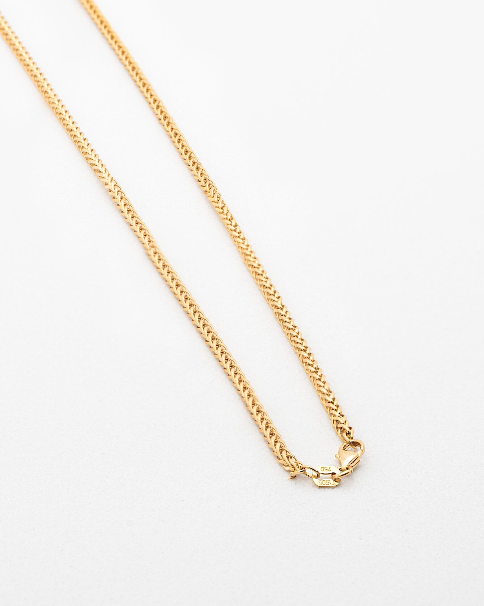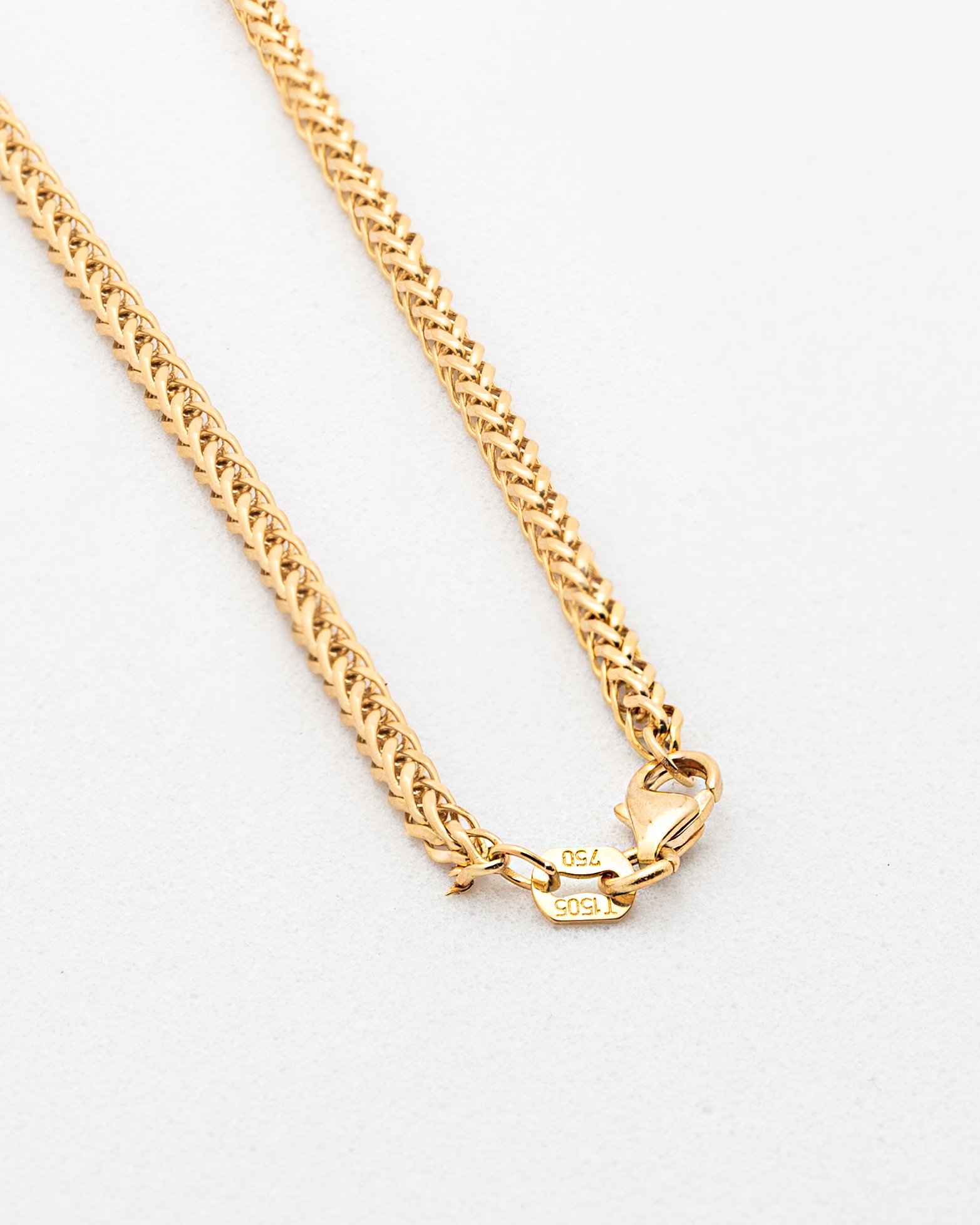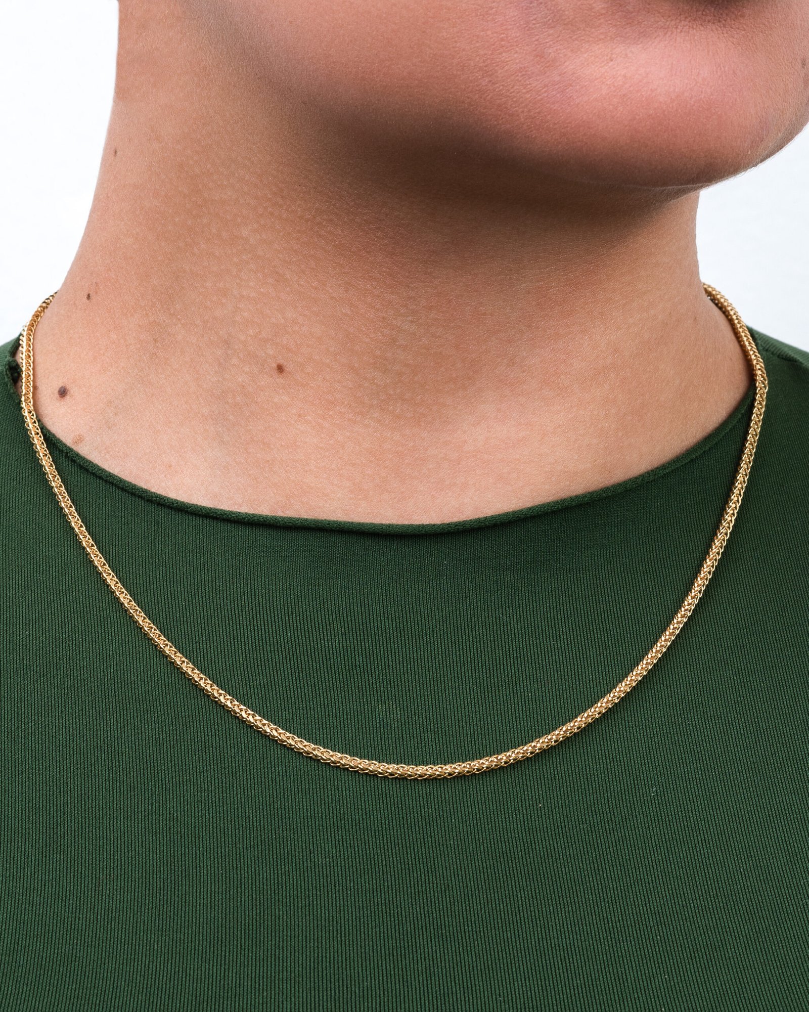 Diseño sólido y elegante que combina resistencia y estilo. Esta cadena se caracteriza por sus eslabones entrelazados en forma de “V” que crean un patrón uniforme, compacto y brillante, ofreciendo un acabado llamativo desde todos los ángulos.